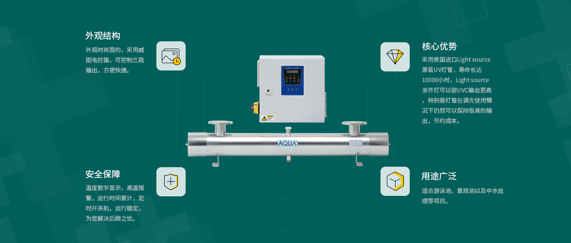 AQUA愛克泳池設(shè)備旗下紫外線殺菌器UVS系列配有智能控制電箱,有溫度顯示、高溫報警等多種功能。