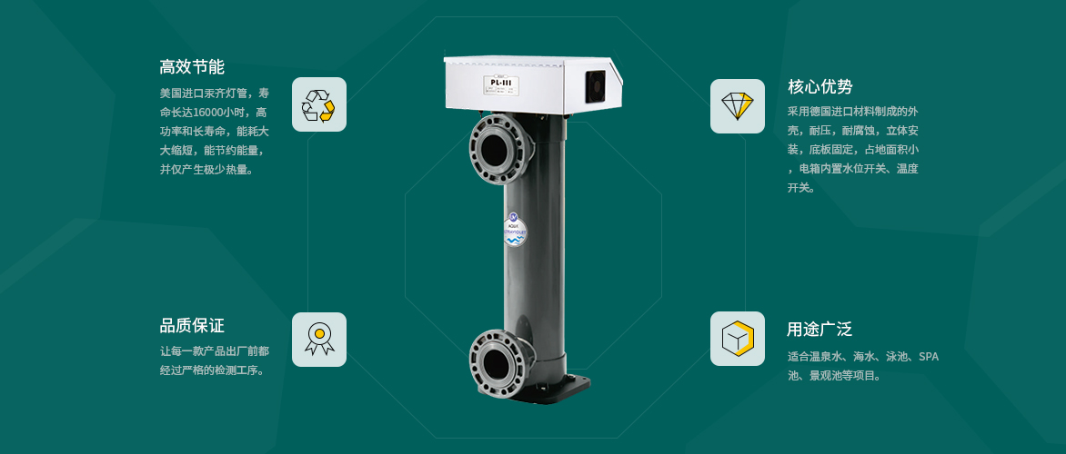 AQUA愛克泳池水處理設(shè)備旗下的汞齊燈高功率和長壽命;立體安裝,底板固定,占地面積小。