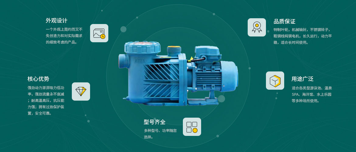 AQUA愛克泳池設(shè)備旗下的泳池循環(huán)水泵水泵適用于70℃的溫泉,承壓可達6kg/cm2,是適合各類型游泳池、溫泉SPA、海洋館等多種場所使用的水泵泳池設(shè)備。