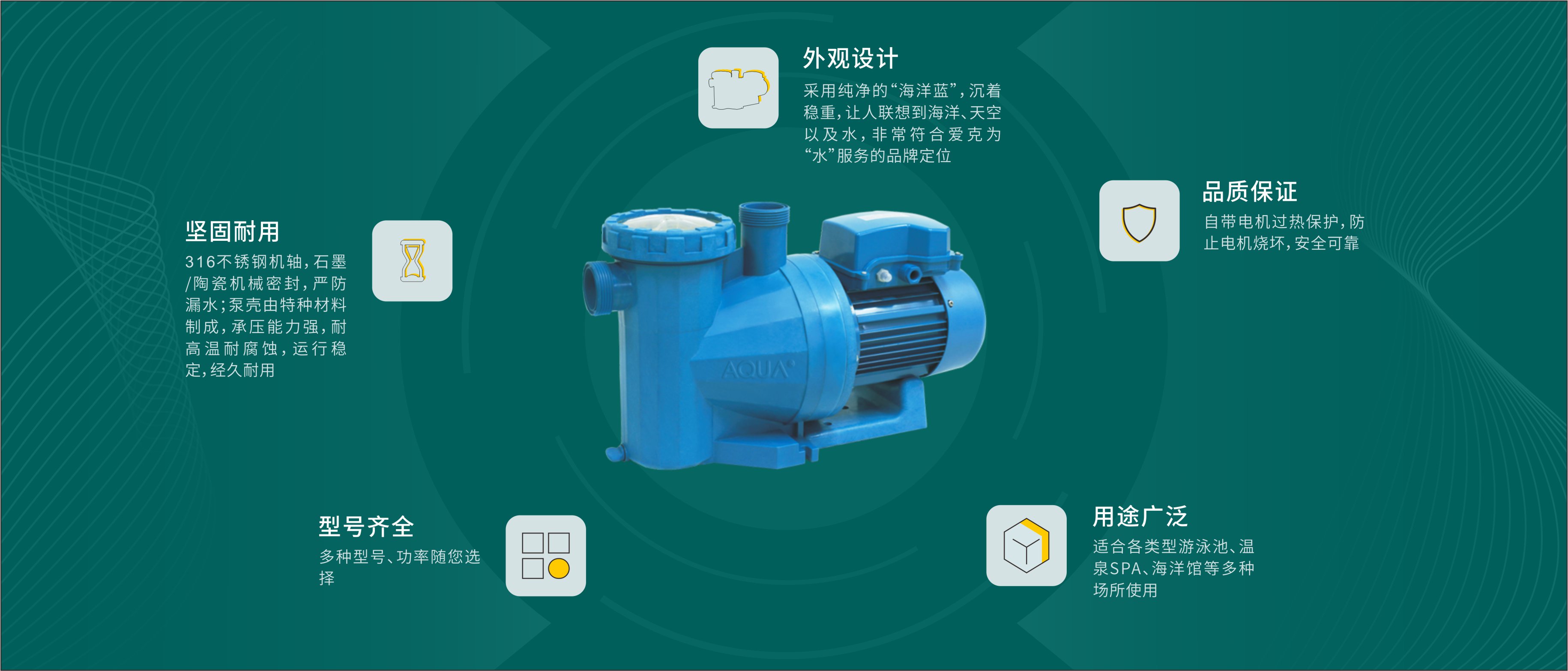 AQUA愛克泳池設(shè)備旗下的泳池循環(huán)水泵水泵適用于70℃的溫泉,承壓可達(dá)6kg/cm2,是適合各類型游泳池、溫泉SPA、海洋館等多種場所使用的水泵泳池設(shè)備。