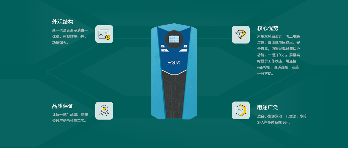 外觀時尚;立體式設(shè)計,占地面積小,節(jié)省空間,安裝簡易,AQUA愛克泳池消毒設(shè)備是游泳池、景觀池、海洋館、凈水處理、水產(chǎn)養(yǎng)殖、廢水處理、車間消毒等項目的理想選擇。